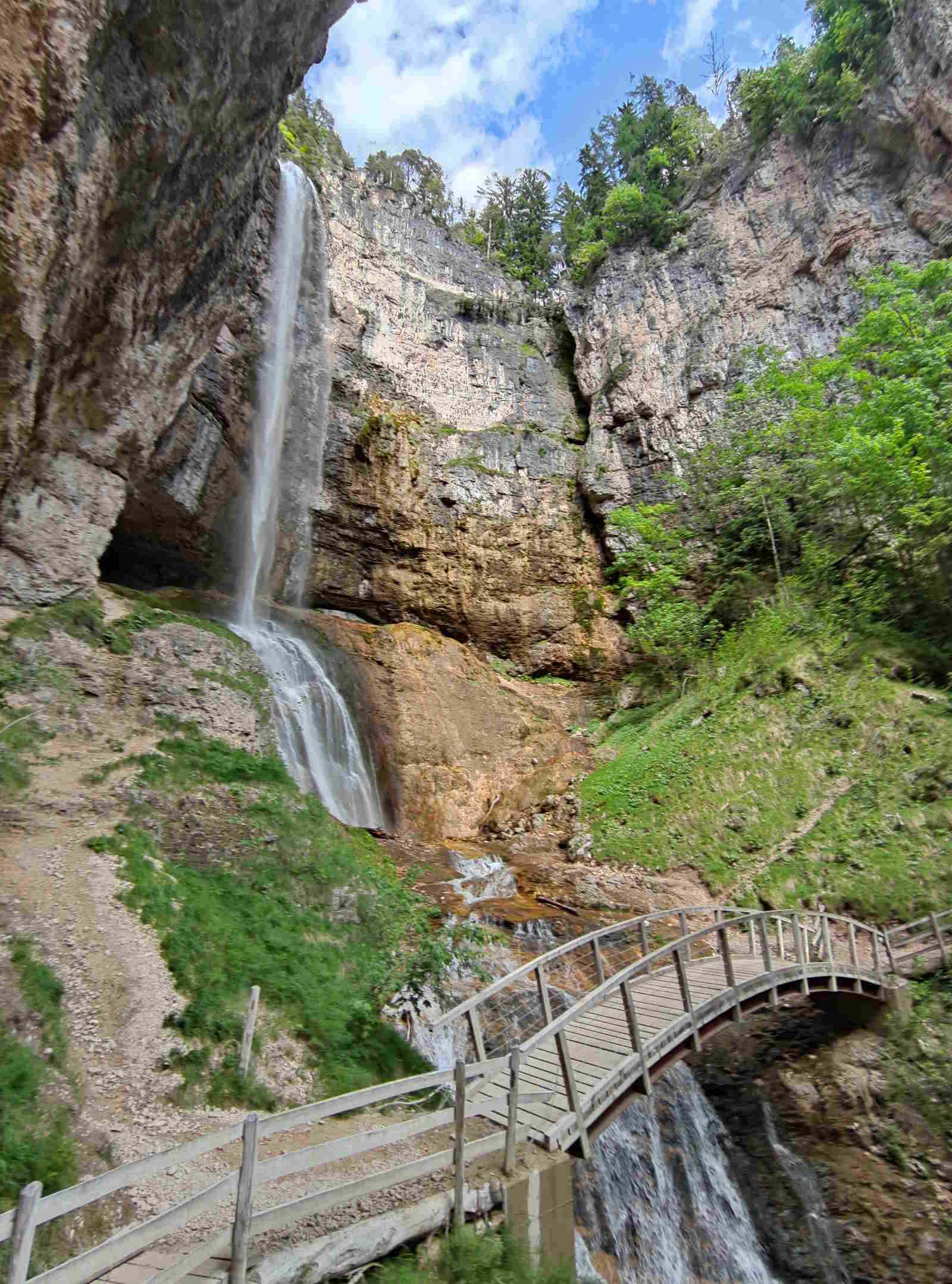 Davanti alla cascata è stato realizzato un ponticello in legno, che permette il passaggio da un versante all’altro dell’imponente salto! Una splendida sensazione essere investiti dalle goccioline d’acqua nebulizzate provenienti dalla cascata che si frange sui tre salti!