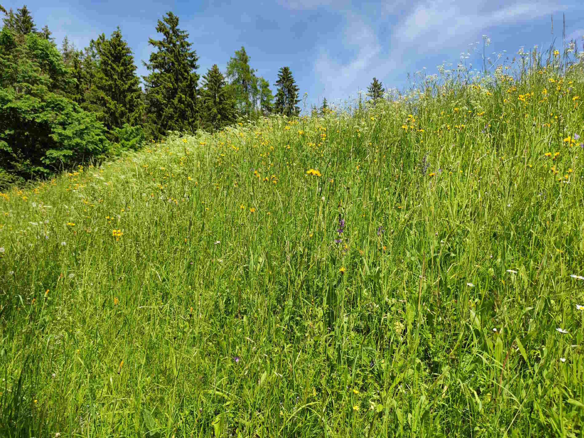 I prati che contornano il sentiero sono color smeraldo, punteggiati dai mille colori dei fiori selvatici. Tutto qui invita al relax e a disintossicarsi dallo stress della vita quotidiana! Respirate a pieni polmoni, guardando il Monte Luco che si staglia in lontananza!